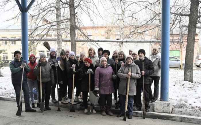 В течение часа участники субботника уничтожали остатки сугробов, не поддавшиеся апрельскому солнцу, постепенно разрушали большую снежную гору на парковке, разбивали ломами наледь во внутреннем дворе Федерации.